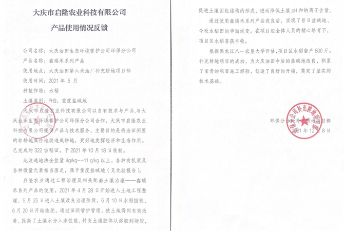 與多所高校、研究院、各大種業(yè)企業(yè)合作種植改良鹽堿地水稻。在黑龍江、吉林、內(nèi)蒙古等地有多處示范基地。在新疆等地區(qū)種植草木,環(huán)境綠化等工程。幾年來,啟隆人大力弘揚“創(chuàng)新、堅韌、拼搏、開拓”的企業(yè)精神,在研發(fā)上勇攀高峰。大慶啟隆 的企業(yè)宗旨是“誠信于鹽堿地的朋友,服務(wù)于鹽堿地的朋友”,努力為鹽堿地改良做出積極的貢獻(xiàn)。